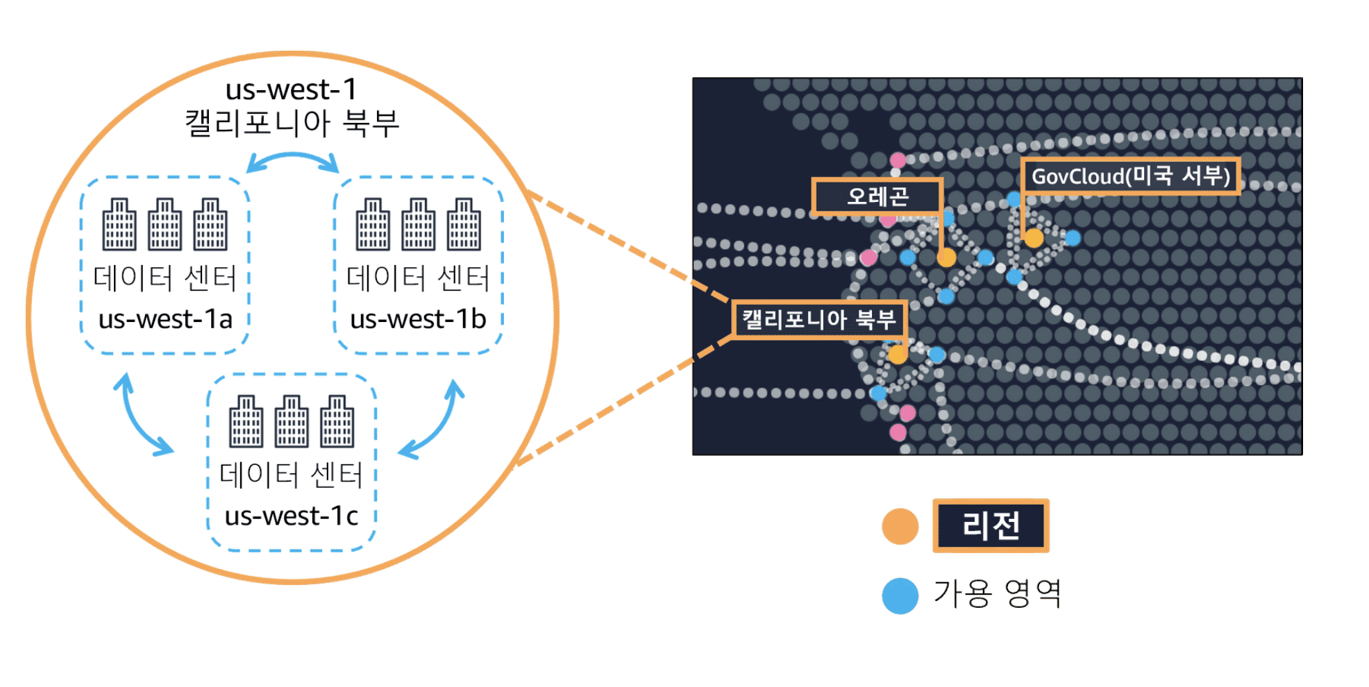 - AZ는 하나 이상의 개별 데이터 센터로 구성되며 각 데이터 센터는 분리된 시설에 구축되고 중복 전력, 네트워킹 및 연결성을 갖추고 있습니다.
