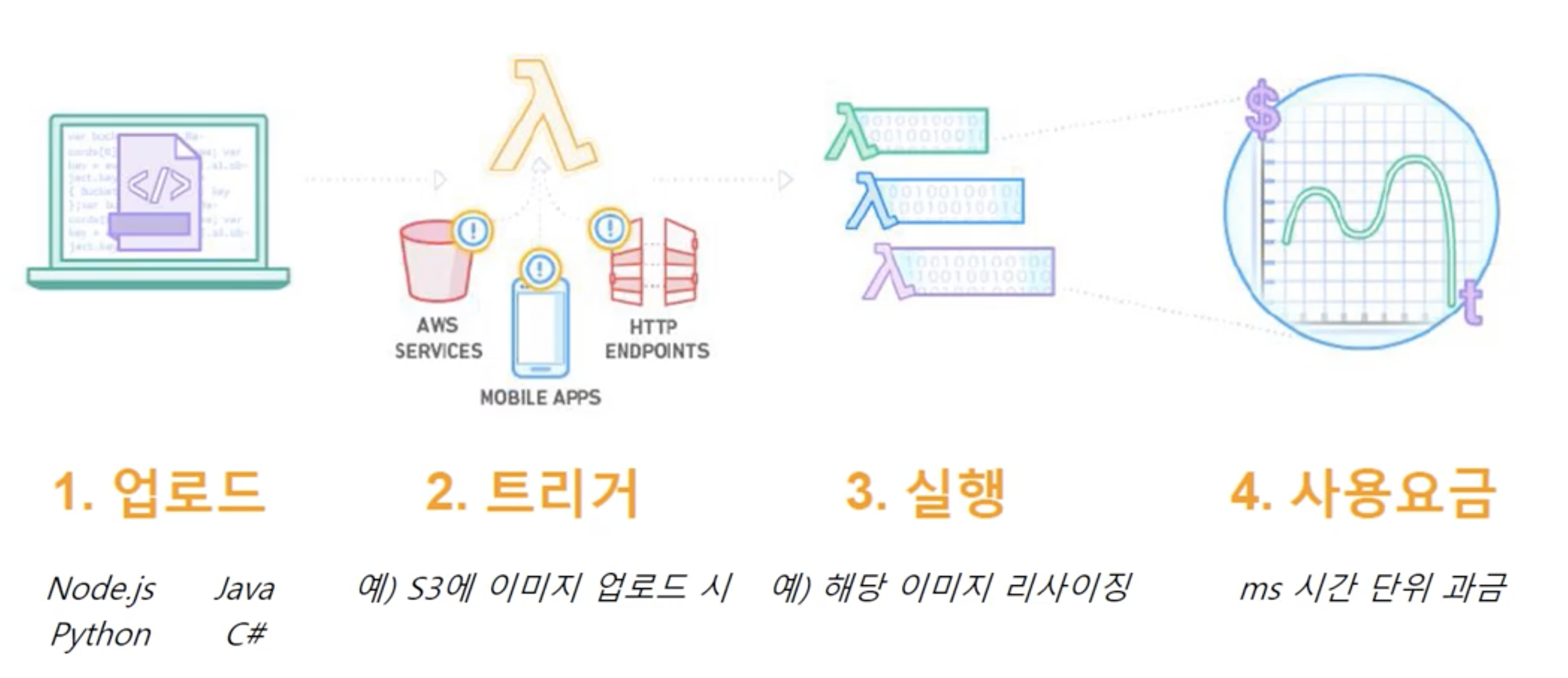 S3에 이미지 업로드시 해당 이미지를 '리사이징' 하는 코드를 넣어두면 항상 서버를 운영하면서 그 서버를 리사이징할 필요 없이 실제 이미지가 스토리지(S3)에 업로드 되었을 때만 컴퓨팅 자원이 실행되서 리사이징됨 ==> 비용절감