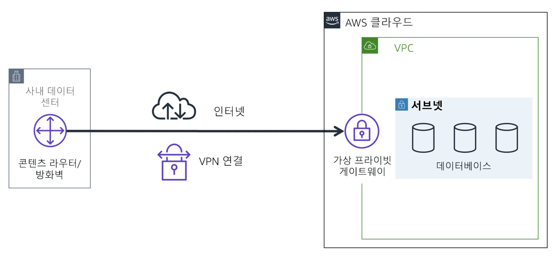 - 가상 프라이빗 게이트웨이는 보호된 인터넷 트래픽이 VPC로 들어오도록 허용하는 구성 요소