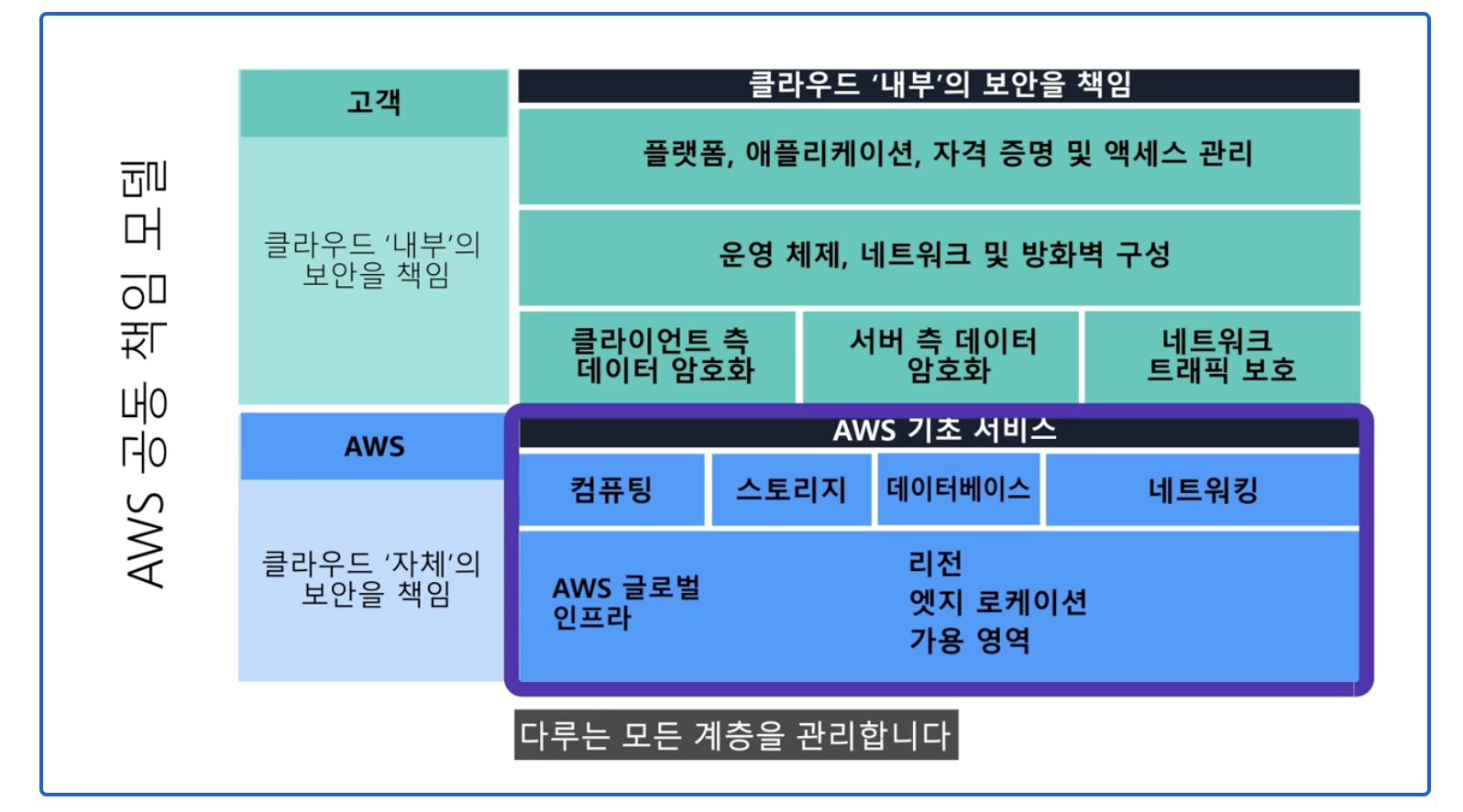 AWS는 AWS 클라우드의 모든 서비스를 실행하는 글로벌 인프라를 보호할 책임이 있습니다. 이러한 인프라에는 AWS 리전, 가용 영역 및 엣지 로케이션이 포함됩니다.