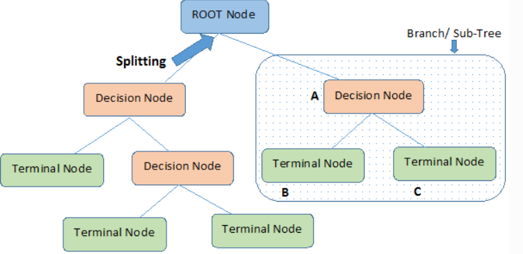 - 결정트리의 각 노드(node)는 뿌리(root)노드, 중간(internal)노드, 말단(external, leaf, terminal) 노드로 나뉠 수 있습니다.