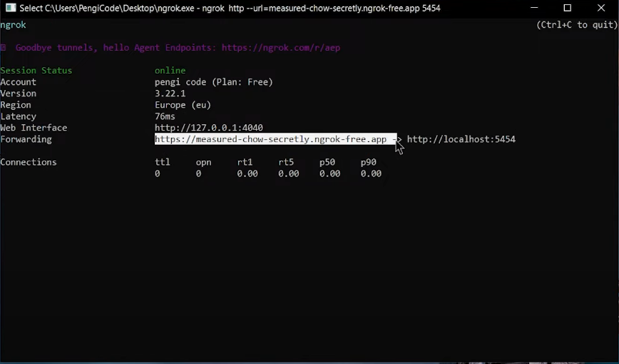 Ngrok 회원가입 후 Ngrok.exe 실행(터미널창이 뜸)