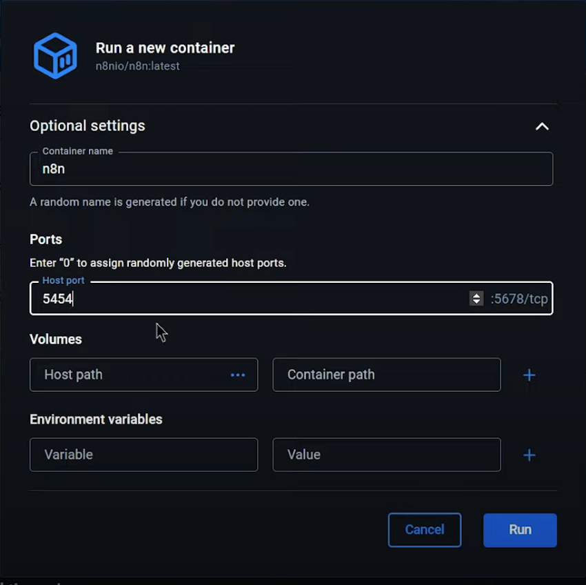 Docker Desktop에서 n8n 이미지를 실행하면 Optional Settings을 설정할 수 있는 UI가 나옵니다.