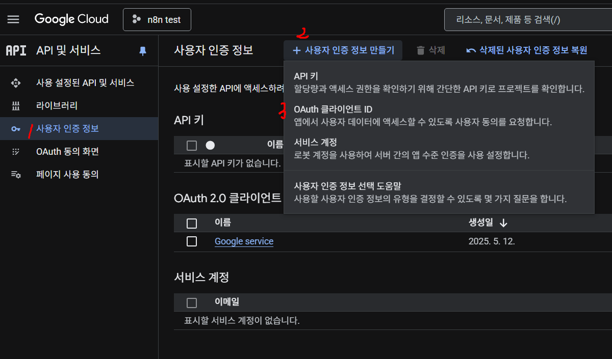 - n8n > Credentials > New Credential > Google OAuth2 선택