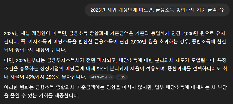 → ChatGPT 응답(실제 Data와 동일): 2025년 세법 개정안에 따르면, 금융소득 종합과세 기준 금액 - 2000만원