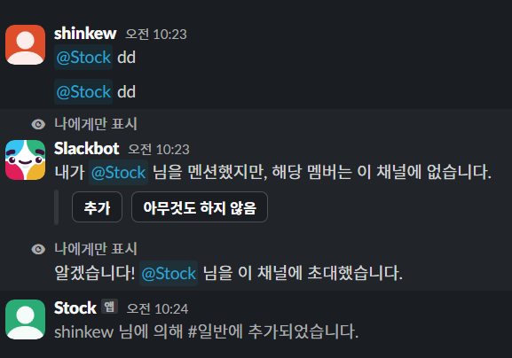 → Slack 채널에서 @앱이름 입력 → “앱 초대” 클릭