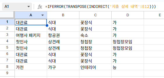 =IFERROR(TRANSPOSE(INDIRECT('지출 상세 내역'!E12)))