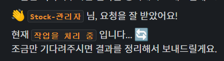 - 사용자가 @Stock을 호출하면 결과가 나가기 전 다음과 같은 메시지가 먼저 전송되도록 구성