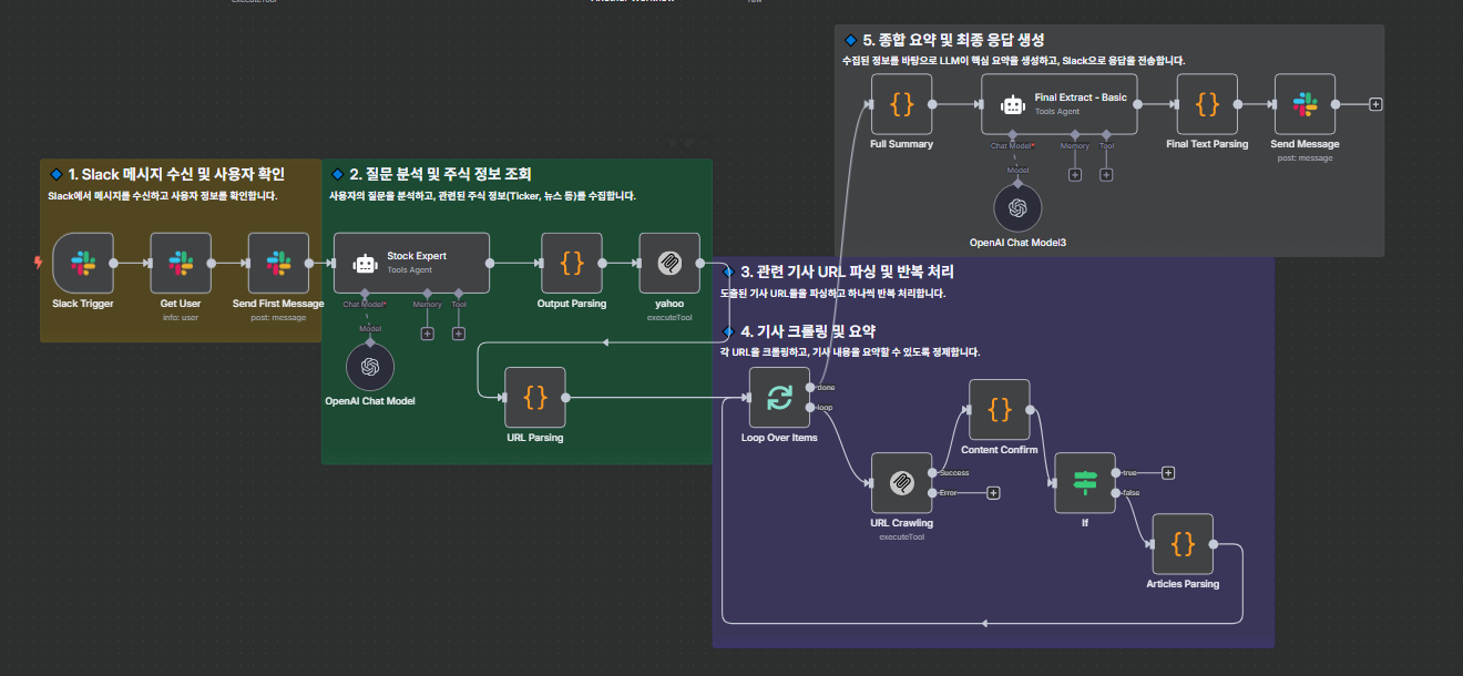 아래는 현재 구성된 워크플로우다. n8n과 Slack, Firecrawl, OpenAI API를 활용했다.