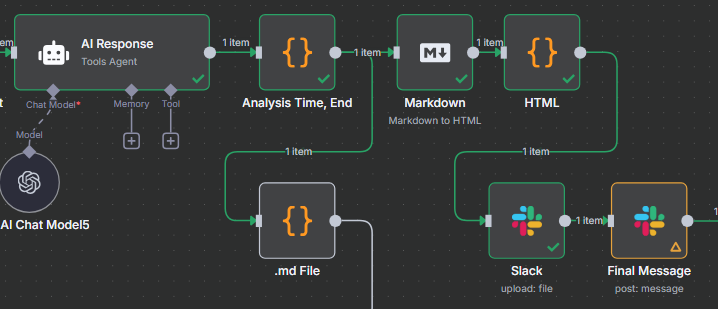 지금은 GPT가 Markdown으로 생성한 리포트를 HTML로 변환한 후, Slack Upload File 노드로