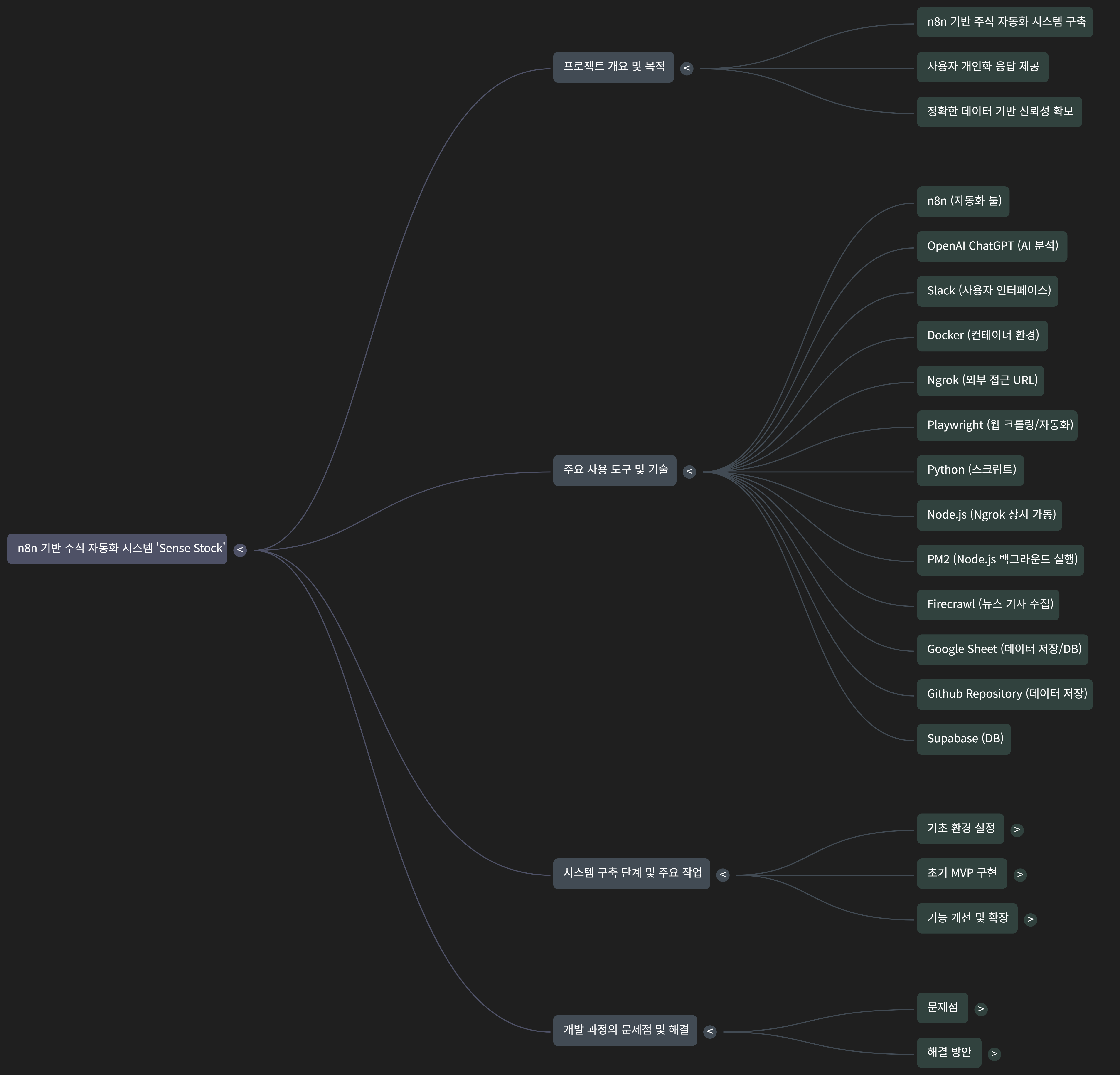 'Sense Stock'은 n8n을 기반으로 주식 시장 데이터를 자동화하고, 사용자에게 개인화된 투자 분석 및 정보를 제공하는 시스템입니다. 초기에는 AI에 의존적인 뉴스 요약 및 종목 추천 기능에 중점을 두었으나, 점차 사용자 제어권과 데이터 신뢰성을 확보하는 방향으로 구조를 개선하고 있습니다.