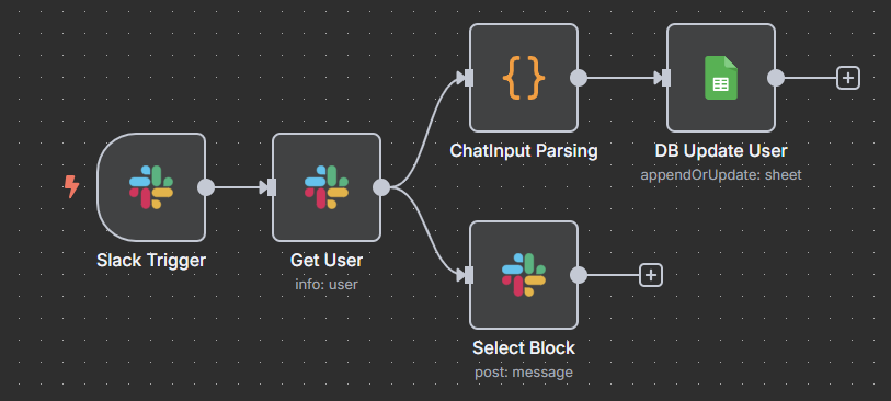 - n8n: Node.js 기반의 워크플로우 자동화 플랫폼으로, 본 시스템의 백본 역할을 합니다. 코딩 없이도 다양한 노드를 조합해 자동화 흐름을 설계할 수 있어 선택되었습니다. Slack 이벤트 수신, API 호출, 데이터 처리, 스케줄러 등 모든 로직을 n8n의 워크플로우로 구현했습니다.