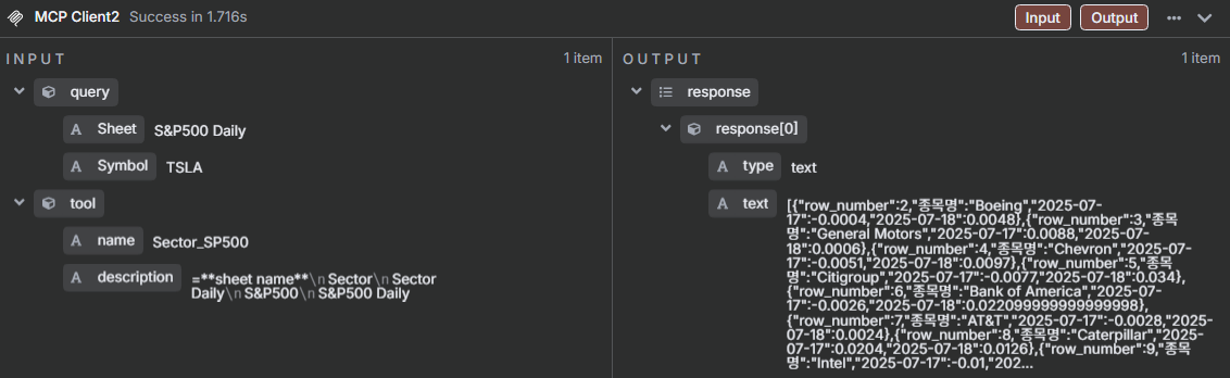 - 근데 GPT는 "테슬라 가장최근 데이터 좀 확인해봐"라는 질문만으로 Sector_SP500 Tool을 자동으로 선택해서 데이터를 조회했다.