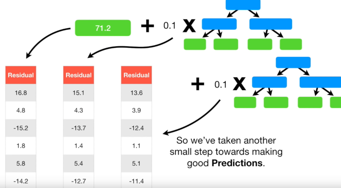 Gradient Boost 모델은 이런식으로 실제 값에 조금씩 가까워지는 방향으로 학습