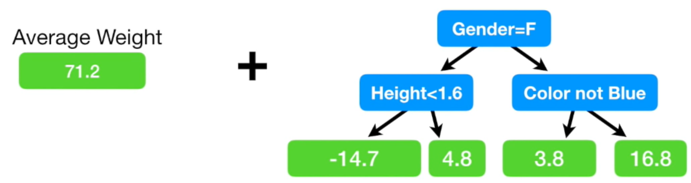 Gradient Boost는 single leaf부터 시작하며, 그 single leaf 모델이 예측하는 타겟 추정 값은 모든 타겟 값의 평균 single leaf에서 예측한 값과 실제 값의 차이(error)를 반영한 새로운 트리를 만들어야 합니다
