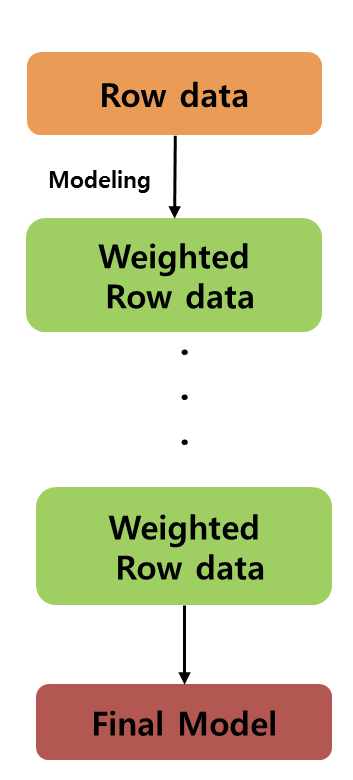 2. 모델링을 통한 예측변수의 의해 오분류된 객체들에는 높은 가중치 부여/