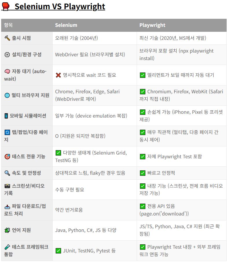 - 속도와 성능: Playwright는 최신 아키텍처(WebSocket)를 사용하여 Selenium보다 일반적으로 더 빠른 속도를 보입니다.