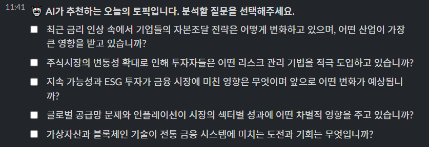 Agent 0이 5가지 질문을 생성 이후, 5가지 질문 중 가장 흥미로운 질문 하나를 선택한다.(Slack Block Kit)