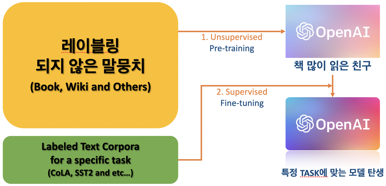 레이블이 없는 방대한 데이터로 사전 훈련된 모델을 가지고, 레이블이 있는 다른 작업(Task)에서