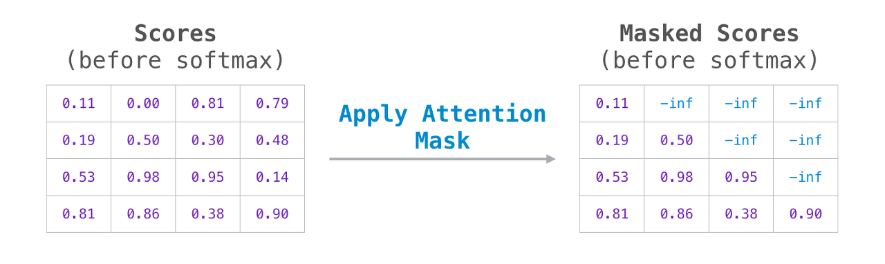 Masked Self-Attention 에서는 Softmax를 취해주기 전, 가려주고자 하는 요소에만 -1e9 에