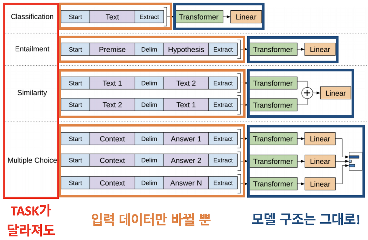 기존 모델에서는 태스크에 맞춰 모델 구조를 변경해주고 학습을 진행시켰습니다.