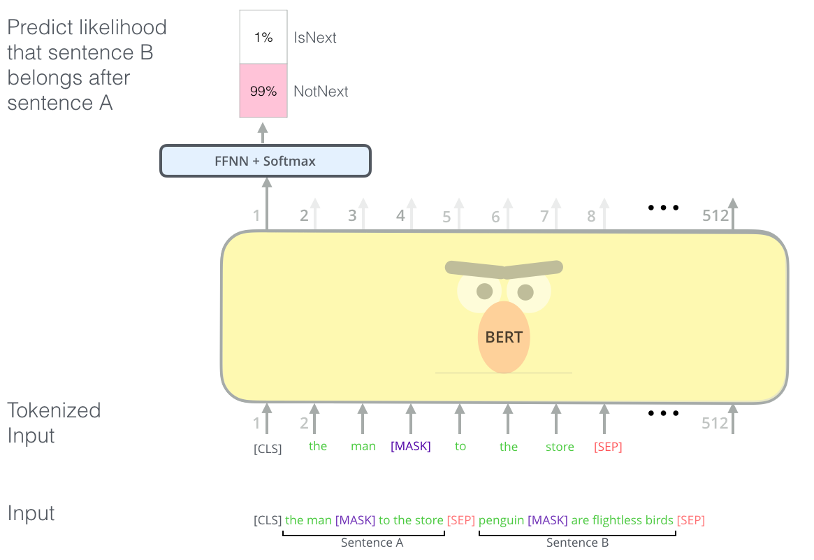 [SEP] 토큰 왼쪽의 문장과 오른쪽의 문장이 바로 이어지는 문장일 경우 [CLS] 토큰의 출력이 IsNext 로 되도록 학습