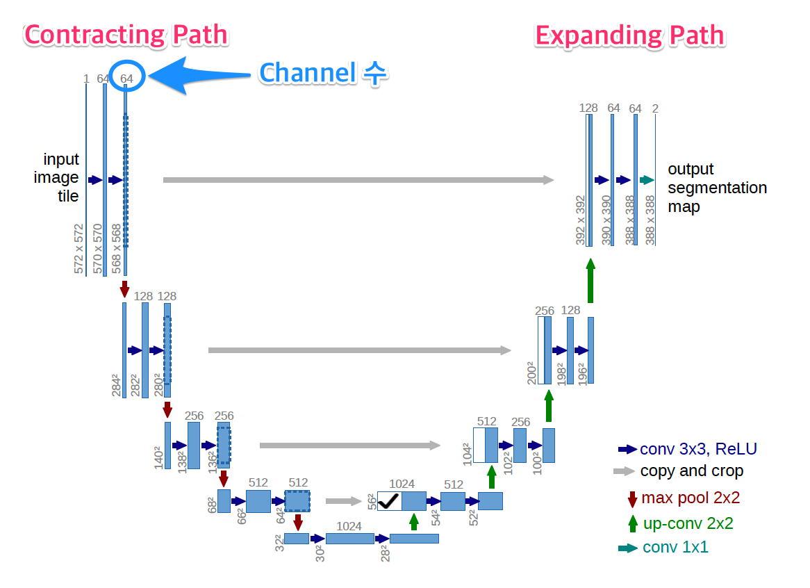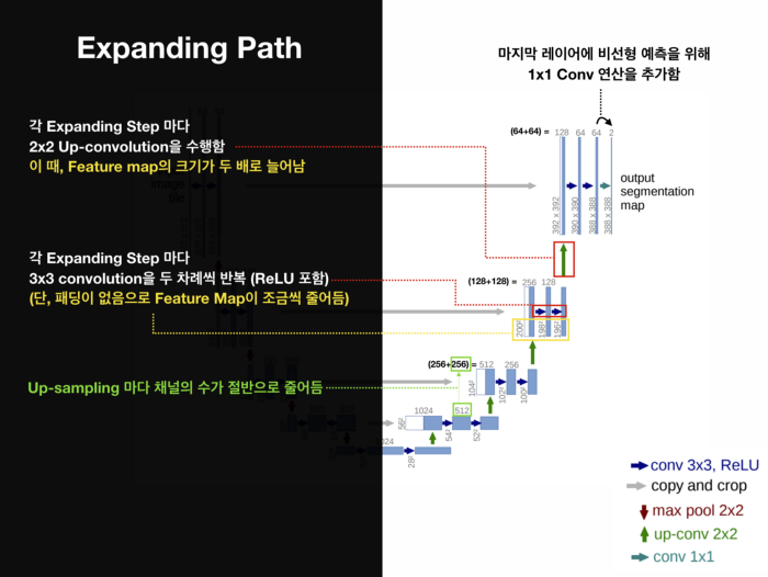그리고 Expanding Path에서는 feature map을 Upsampling한 뒤, 이를 Contracting Path에서