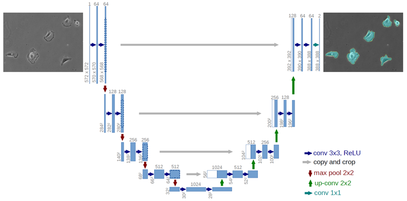 상단 그림에서 확일할 수 있다시피 Input 사이즈는 572×572지만, Output 사이즈는 388×388이다. 이는 padding