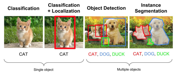 | 분류 | 분류와 위치 | 객체 탐지(여러개) | 픽셀단위로 분류(Segmentation) |