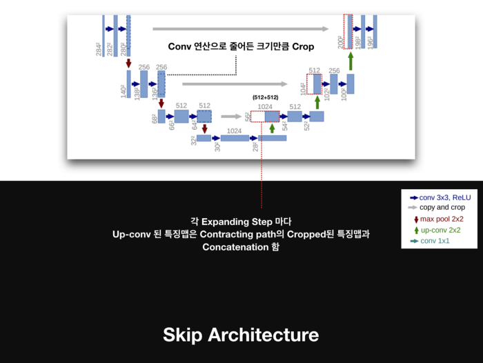 Contracting Path에서 Pooling 직전 단계의 feature map을 복사해 Expanding Path에서 대응되는 feature map에 concat 시킨다. 주의할 점은 앞서 설명했듯이 missing data가 발생하기 때문에 Contracting Path의 feature map에 비해 Expanding Path의 feature map의 크기가 더 작다는 것이다.