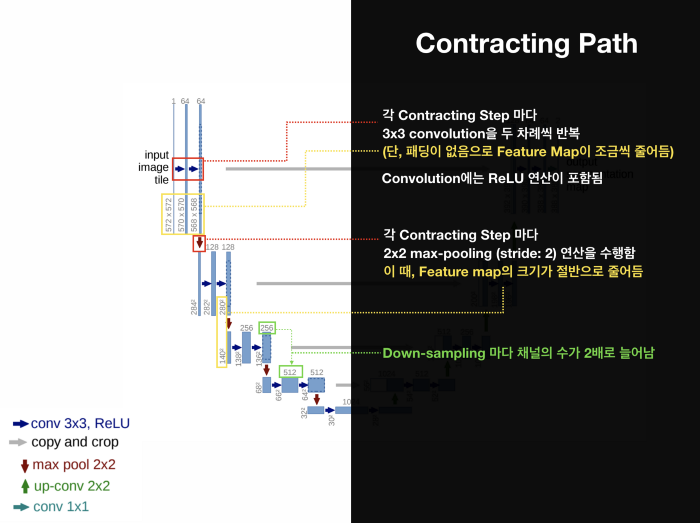 2) Contracting Path에서는 이미지의 context를 포착한다.(= context는 서로 이웃한 이미지 픽셀 간의 관계를 의미)