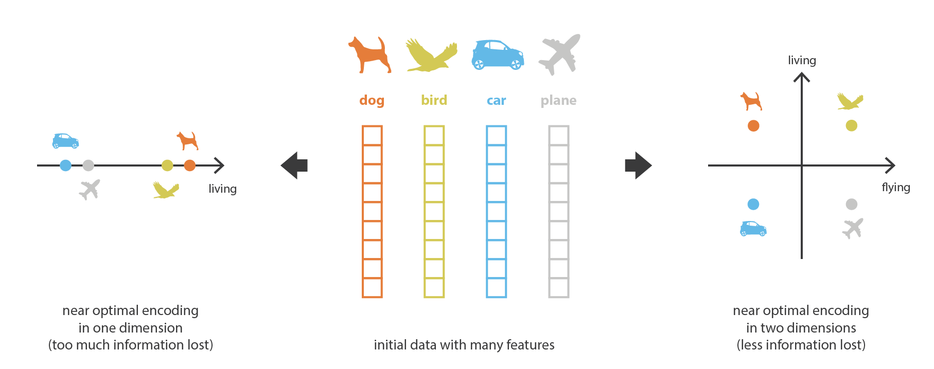 그림1은 자동차, 비행기, 새, 강아지를 하나의 1차원 벡터(실수)로 압축한 것이고,