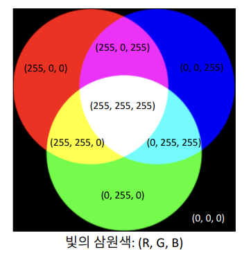 • R, G, B 색 성분의 크기를 각각 0 ~ 255 범위의 정수로 표현