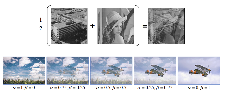 # 두 이미지의 가중치 합은 되도록 1로 설정 => 두 입력 영상의 평균 밝기를 유지