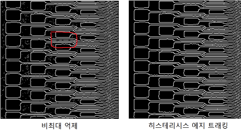 * 비최대 억제에서 중간중간 흰색 부분이 있는데 해당 부분은 Edge로 판단이 되지 않음