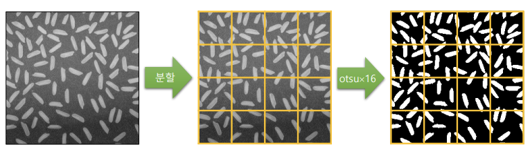 - 전체 영상을 n등분하여 각각의 구역마다 따로 이진화하고 이어 붙임(= Window)