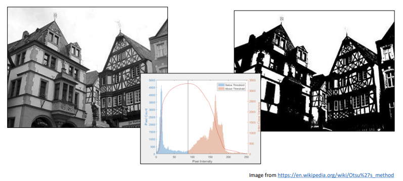 • 임의의 임계값 T 에 의해 나눠지는 두 픽셀 분포 그룹의 분산이 최소가 되는 T 를 선택