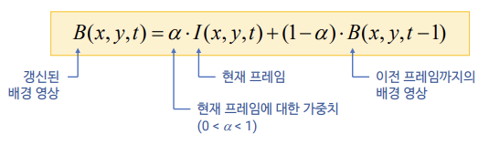 - 수백 장의 영상을 저장하는 대신 매 프레임이 들어올 때마다 평균 영상을 갱신