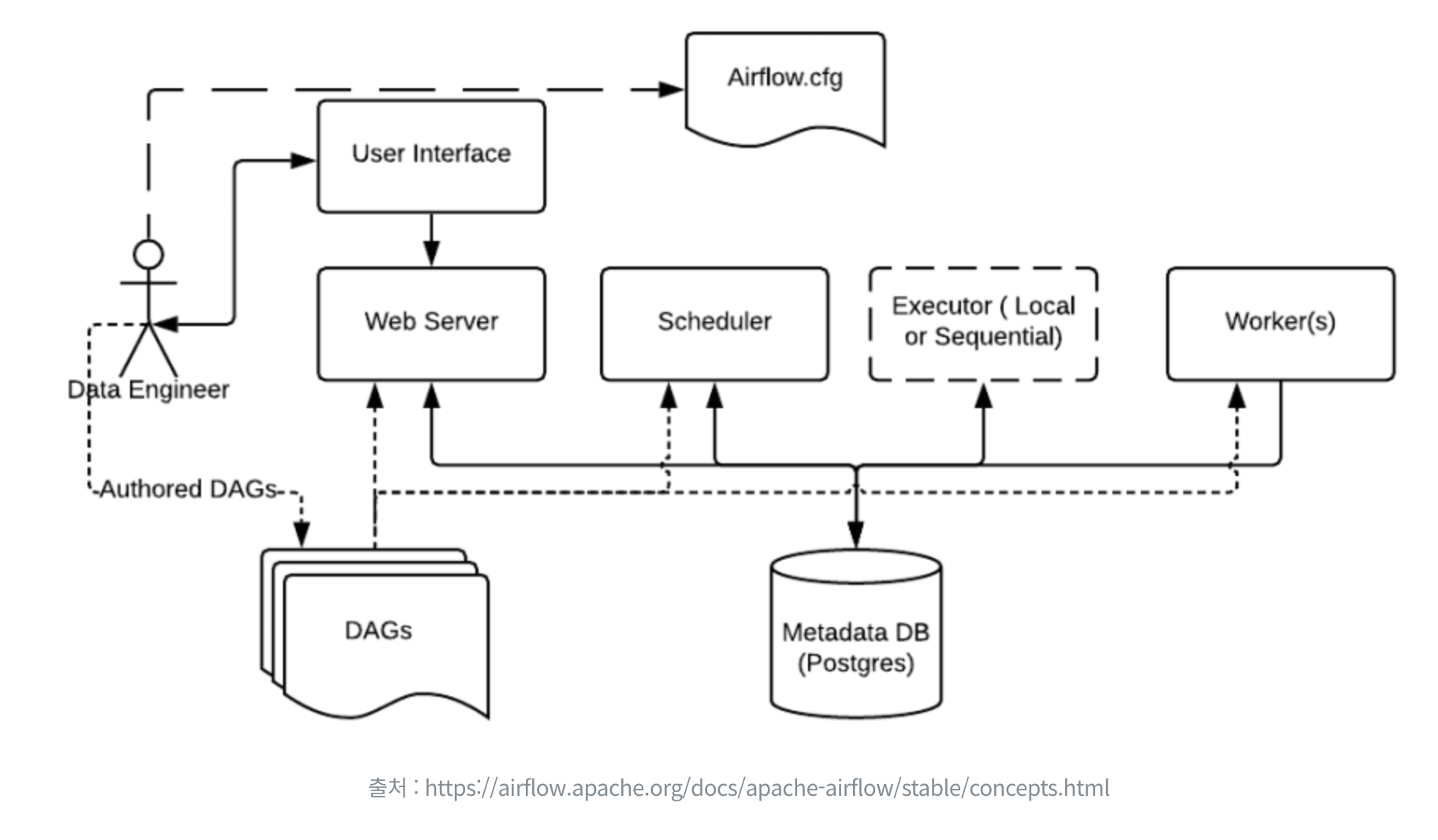 * Database : Airflow에 존재하는 DAG와 Task들의 메타데이터를 저장하는 데이터베이스입니다.
